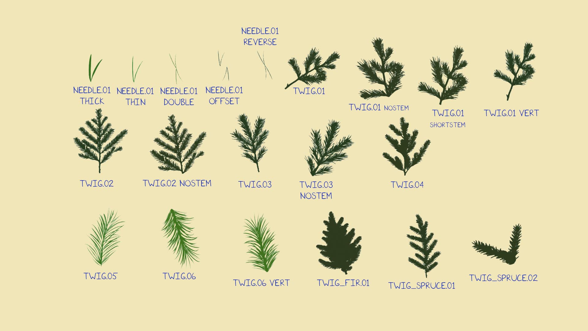 Free Grease Pencil pine twig brush packs.  Use these to follow along with my YouTube tutorial on making a stylized pine tree in Blender 5 using the new Array Modifiers.