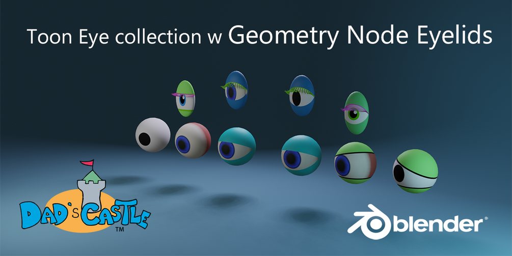 Includes all the variations covered in my DadsCastle Blender tutorials on YouTube! There are both geometry node and procedural eyelids, as well as eyelashes. There is also a simple rig to demonstrate how to use eye and eyelid drivers. You can select two different procedural eyes - simple toon and stylized - however they should work on most eyeball shaders that are based on a UV Sphere.